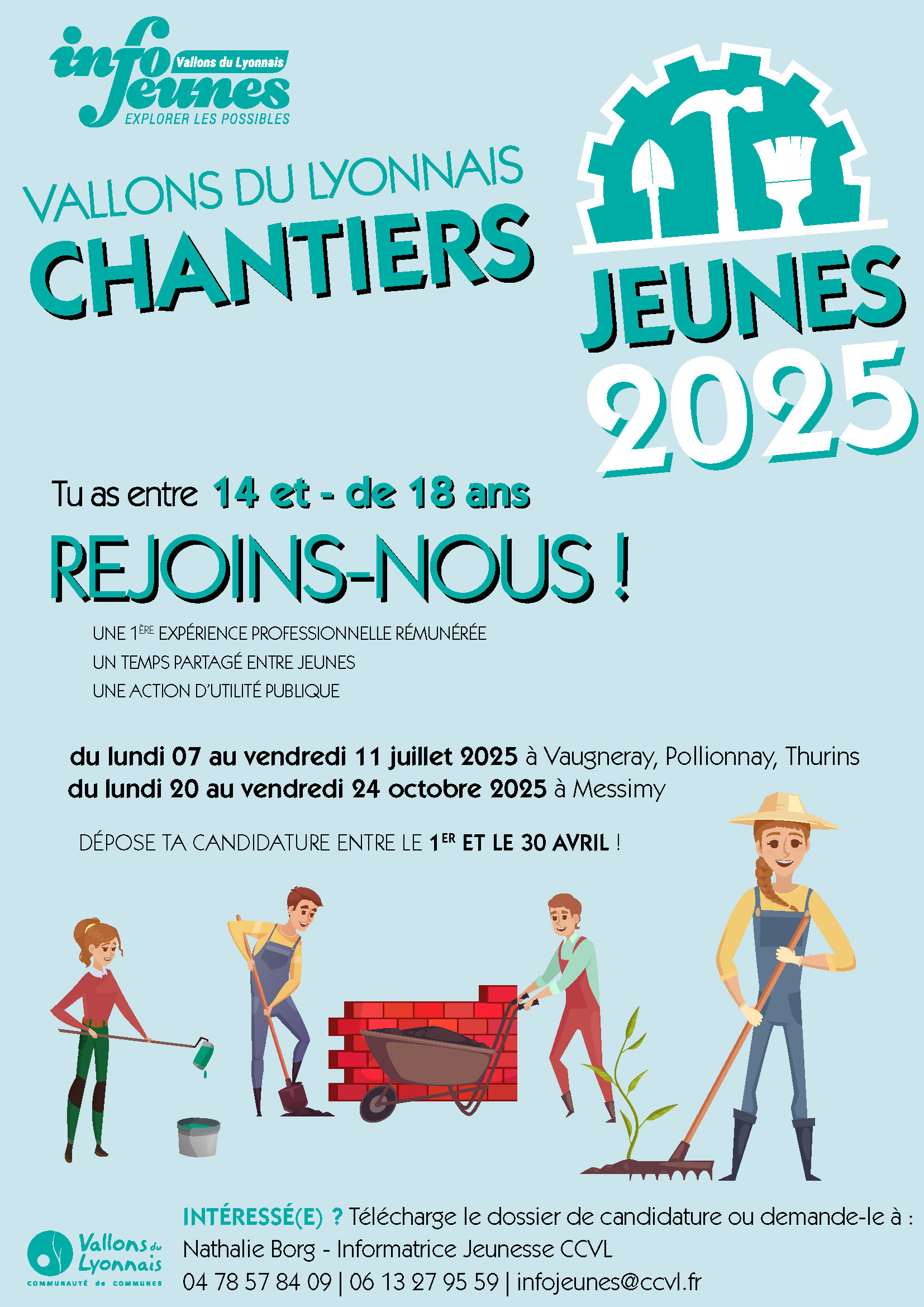 Créés en 2022, les chantiers jeunes intercommunaux sont proposés aux jeunes de 14 à 17 ans révolus domiciliés sur les communes de la Communauté de communes des Vallons du Lyonnais (Brindas, Grézieu-la-Varenne, Messimy, Pollionnay, Ste Consorce, Thurins, Vaugneray et Yzeron).