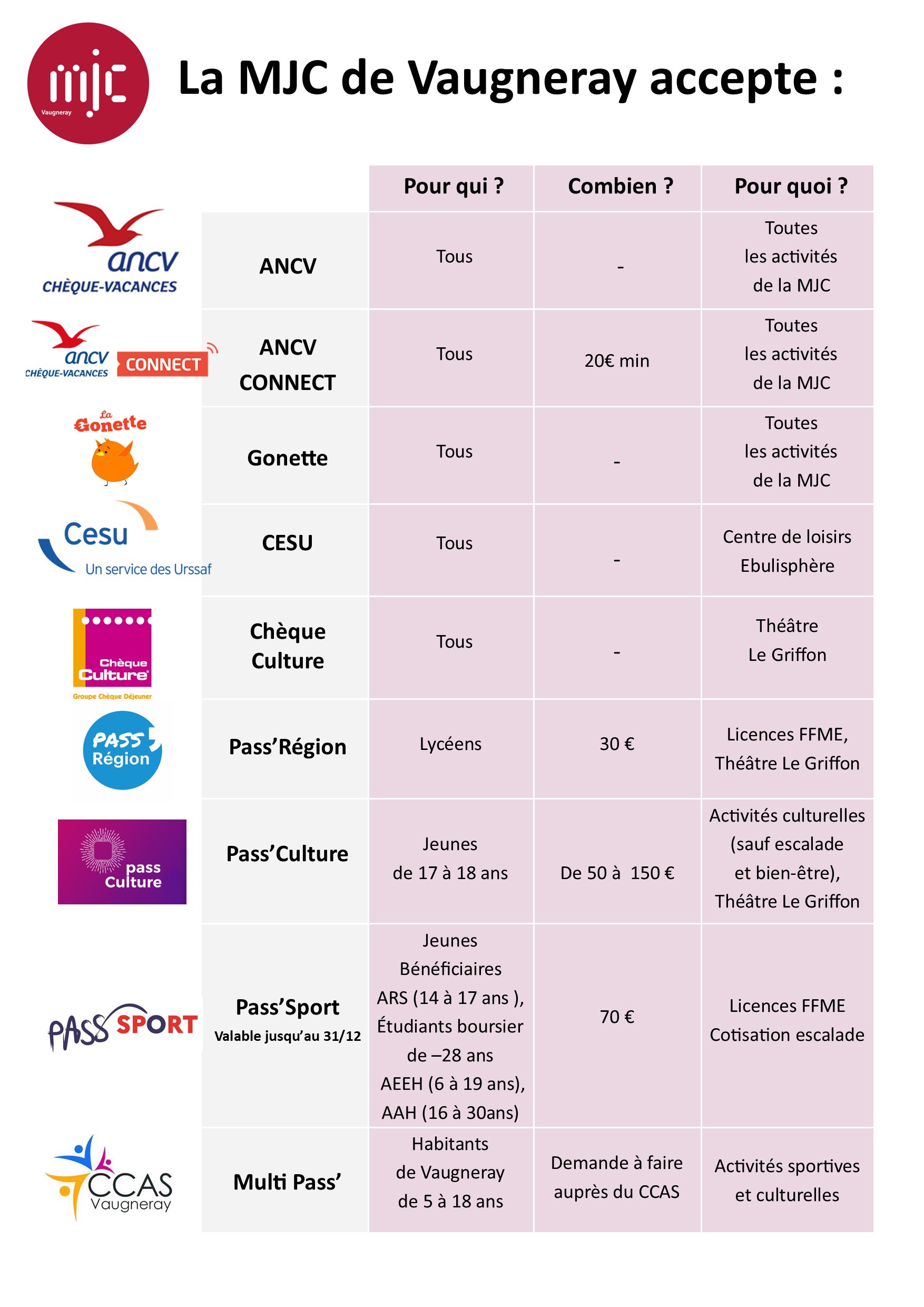 Différents dispositifs mis en place par l'état et les collectivités existent et peuvent vous aider à financer une partie de vos activités à la MJC :